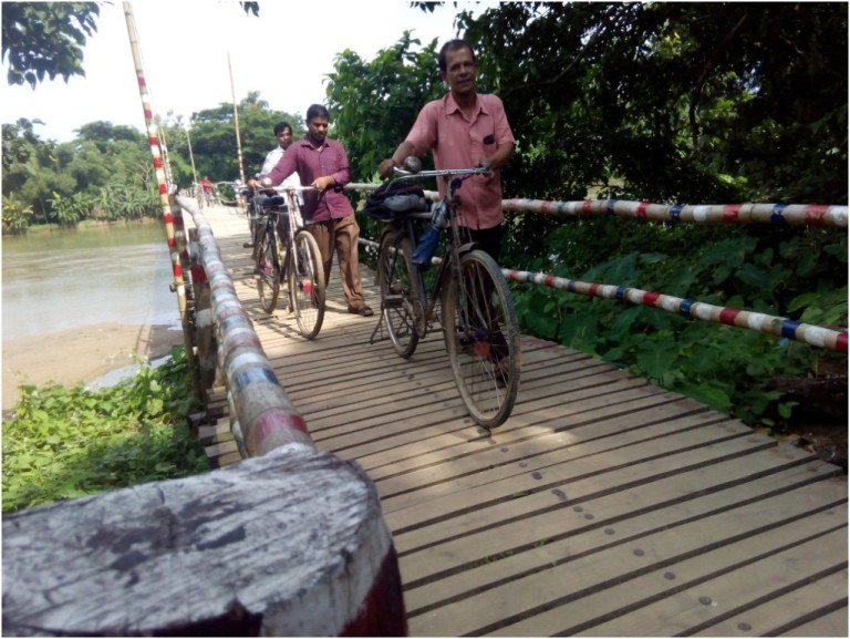In Lengura the community people used to cross Ganeshwari river by boat every year. The bamboo `chattay’ was made to make passengers conveniently walk when the river water decreased. They noticed that in many cases, the passengers faced difficulties by crossing the river by boat, especially the students and the elderly. These ten people often talked with each other about how to solve this problem. Then they took an initiative to build a wooden bridge on the river. They started by collecting funds and begin to make the bridge of wood.