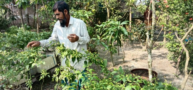 Abdul Hakim has loved farming since childhood. Despite recurring natural disasters, he grows a variety of vegetables, fruits, rice, and fish on his land. His production includes over 20 types of crops and fish 0such as spinach, eggplant, pumpkin, tomato, fennel, rice, as well as carp, catla, tilapia, prawn, and more.