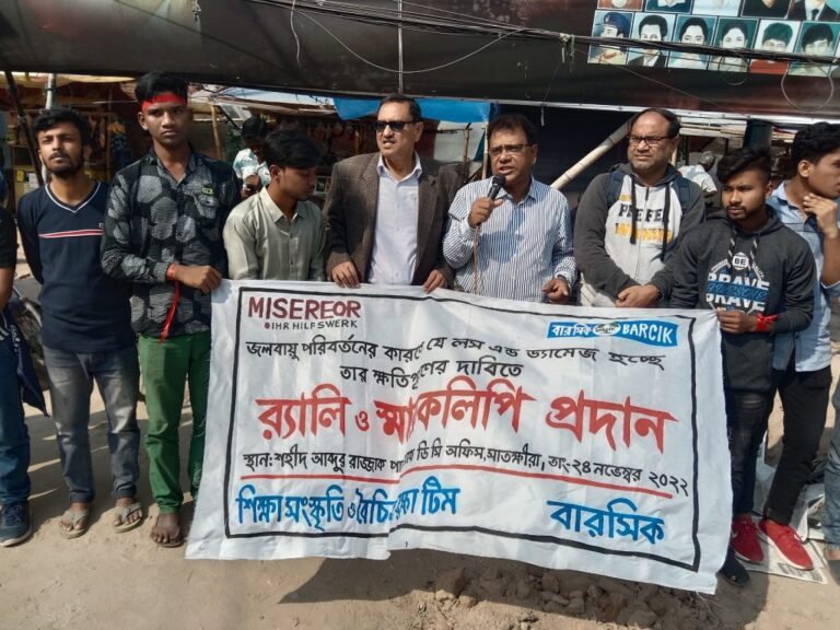 The coastal region of Bangladesh has been facing disasters one after another due to climate change. These disasters damage crops, uproot trees and kill many lives. However, in order to demand compensation for the loss and damage caused due climate change rally and human chain were held in Satkhira. Later a memorandum was submitted to the District Commissioner on the same demand.