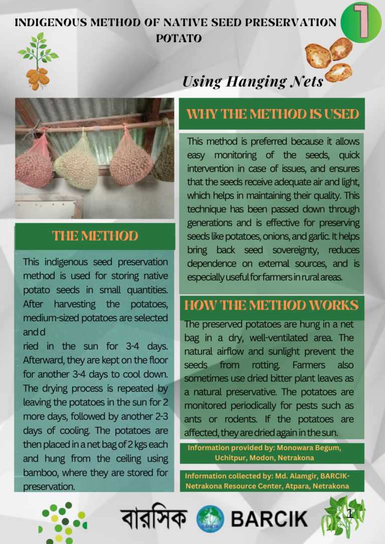 PosterIndigenous Method of Potato Native Seed Preservation March 3, 2025 Bangladesh Resource Center for Indigenous Knowledge These images show on how one can preserve native potato seeds using indigenouse Method. Facebook Twitter LinkedIn WhatsApp Messenger Email Print PrevPreviousBilkis Begum Gains respect and economic solvency practicing Agroecology NextGreen Manure Enhances Soil fertilityNextPartners More Posts A small initiative that built big confidence among schoolgirls Agroecological practices bring new life to Coastal Family Climate change leads to climate crisis test video When recognition heals wounds… Netrokona farmer fights to save disappearing seeds_The Climate Watch World Wetlands Day Observed by BARCIK Rajshahi Resource Centre. World Fishing Cat Day observed by BARCIK Netrokana Resource Centre. Report on Present energy use by urban poor and challenges for adoption of Renewable Energy in Bangladesh Two local news paper covered BARCIK and Green Coalitions training sessions. Send Us A Message Full Name Phone Email Message Send Stay Connected Facebook Linkedin Youtube Instagram X-twitter Related Publications A small initiative that built big confidence among schoolgirls March 5, 2026 Agroecological practices bring new life to Coastal Family March 2, 2026 Climate change leads to climate crisis March 1, 2026 test video March 1, 2026 When recognition heals wounds… February 24, 2026 Netrokona farmer fights to save disappearing seeds_The Climate Watch February 22, 2026 World Wetlands Day Observed by BARCIK Rajshahi Resource Centre. February 3, 2026 World Fishing Cat Day observed by BARCIK Netrokana Resource Centre. February 2, 2026 Report on Present energy use by urban poor and challenges for adoption of Renewable Energy in Bangladesh January 20, 2026 Two local news paper covered BARCIK and Green Coalitions training sessions. January 19, 2026 BARCIK received Agro Award from Channel I and Standaed Chartered bank was covered by both The Daily Star and Prothom Alo January 8, 2026 Agroecology is a climate solution January 8, 2026