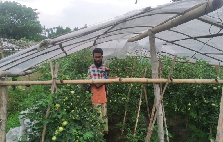 Mahmudul Hasan of Bishwanathpur village in Amtala union of Netrokona district have harvested success in cultivating summer tomato for the second time. Last year, for the first time he experimentally farmed tomatoes in summer season and succeeded. He replicates the learning in farming summer tomatoes by farming the same crop in the same season covering more lands. And again, this time also he succeeded as he harvested huge yield that inspirers other farmers in his village. His initiatives has caught the attention of people and many passers-by stopped on their way to have a look at his tomato field! However, young Mahmudul had an accident in the near past and lost one arm at that accident but he did not lose heart rather he always tried to learn from other experienced and skilled farmers. His is an innovative and creative persons. It is his creativity and innovation that leads him to experimentally farm tomatoes in summer season!