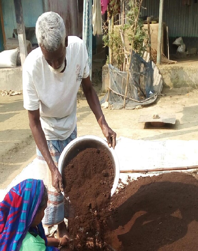 The eagerness and inspiration he gathered from the exposure visit Musharraf Hossein uses his own vermin compost instead of chemical fertilizers to produce safe food. He is making and using vermin compost at home. So far, he has helped 27 like-minded farmers with earthworms and helped them building houses to prepare vermin compost that could help them farming well and producing safe foods.