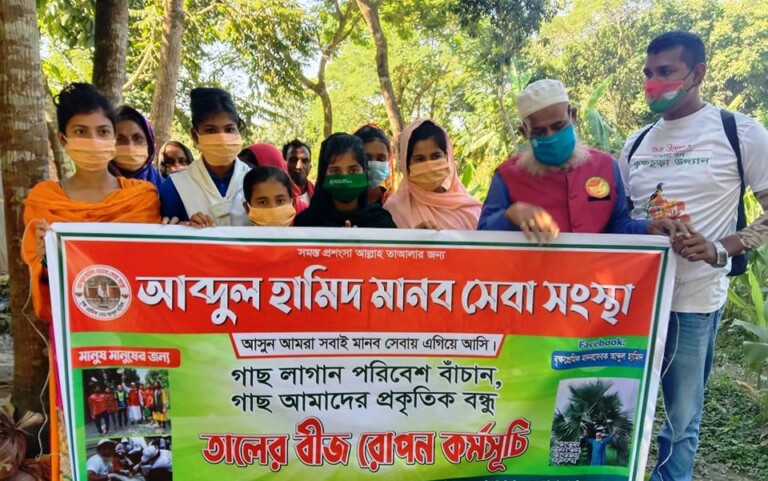 Kabiraj Abdul Hamid is a nature lover and good human being from Netrakona region. For the last 10 years, he has been planting palm trees to protect and others from lightning and thunderstorms. He has so far, planted a total of more than 25,000 palm seeds in different parts of Netrakona region. He is also creating awareness among the youths, youth organizations of the village, the farmers’ organizations, the students of the school through meetings, lectures, classes in the school about the importance to conserve biodiversity, protect the environment. This year he has collected palm seeds in the village, in the town house, in the dustbin thrown away by people. He has collected about 4,000 palm seeds from those places and planted them in five streets of Netrokona. Most recently he has made awareness among the youth organization named ‘Oxygen Youth Organization’, adolecent girls’ organization ‘Kusumkali Kishori Sangathan’ and ‘Rakhal Bandhu Krishak Sangathan’ of Darunbali village of Netrokona Sadar Upazila. He distributed tree saplings to the members of the organizations with free of cost and encouraged them to plant those saplings in their houses, roadside and fallow lands.