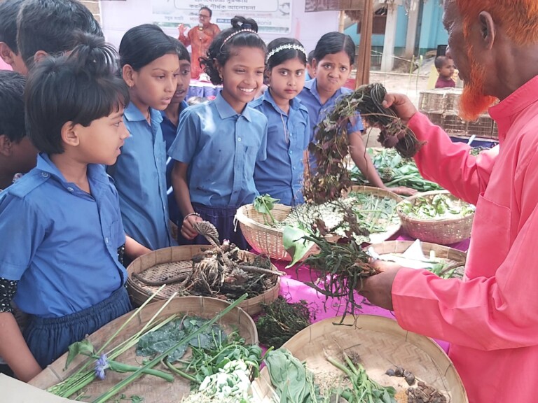 The morning was filled with colors and stories of life. Tithi Sutradhar, a fifth-grade student from Gokul-Mathura village in Tanore, Rajshahi, participated in a unique art competition. Her drawing portrayed the aquatic life and natural beauty of Biljoyana and Bilkumari and it won her first prize. When Tithi later visited the uncultivated plant stall at the fair and curiously asked about the singra plant, the answer came in poetic verse from local poet and Ayurvedic healer Afaz Uddin. This vibrant celebration of biodiversity and folk culture was the Biodiversity Festival 2025.