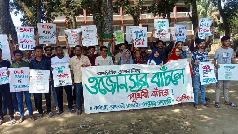 ‘We have only one Earth, so let’s not destroy it through excessive consumption. The rich nations, through carbon pollution, are damaging the atmosphere, leading to the depletion of the ozone layer, which acts as the Earth’s sunscreen. In response, environmental organizations and students from Netrakona district held demonstration, carrying colorful banners, placards, and posters, calling on rich countries to take action to protect the ozone layer.