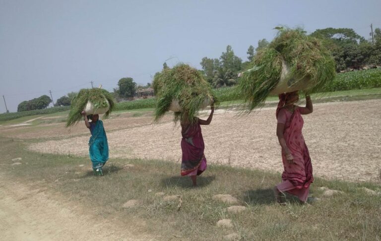 Char means a tract of land surrounded by water of ocean. People of living in the char area many times faces natural disasters such as flood and riverbank erosion. These disasters often wash away their homes, kill life and destroy their crops and other resources. However, the women of Harirampur char area are the ones who work hard in the fields and at home from morning to evening and struggle to survive. They do not work only at homes but also in the agriculture lands and collect fuels and fodders for livestock all the day round. Aklima Begum, a woman farmer of Salimpur village, said, “We pass day and night through the pastures and trees.” She said that she wakes up early in the morning and starts working and does not sit down for the whole day. Almost all the women of the village after finishing the household chores go to the pasture lands to collect fodder for their livestock.